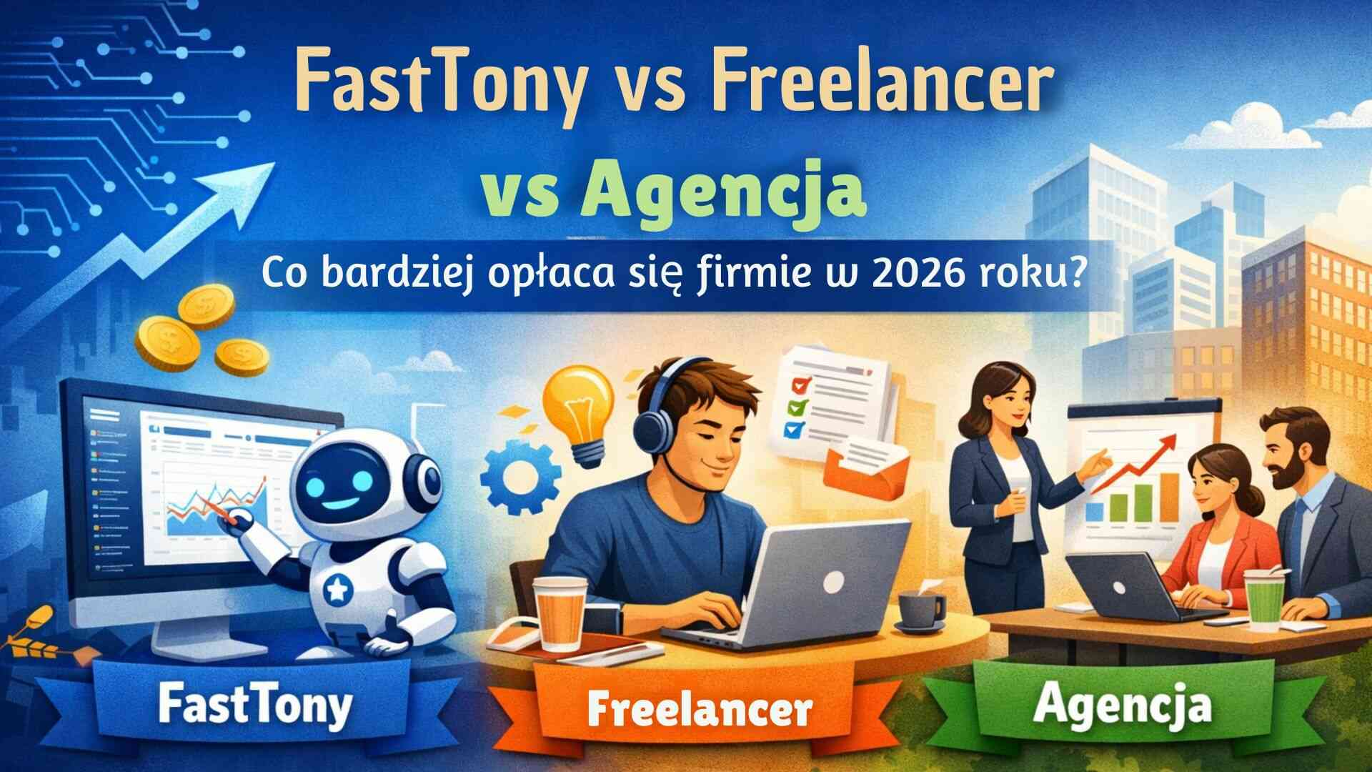Odpowiedź nie zawsze jest taka sama. Wszystko zależy od budżetu, skali działań, czasu, jakim dysponuje właściciel firmy, i tego, jakiej wygody oraz kontroli oczekuje. W tym artykule porównujemy FastTony, freelancera i agencję pod kątem kosztów, wygody, jakości współpracy, przejrzystości działań i możliwości rozwoju.