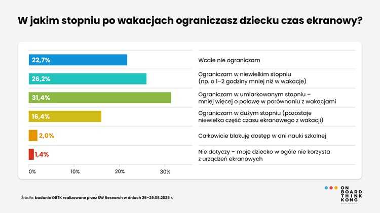 Z badania zrealizowanego na zlecenie agencji On Board Think Kong wynika, że ponad połowa rodziców ocenia korzystanie przez ich dzieci z narzędzi AI w nauce jako pomocne. Jednocześnie tylko około 10% ankietowanych uważa tę kwestie za problematyczną. A tylko niemal 9% rodziców deklaruje, że jego dziecko wcale nie korzysta z AI w edukacji. Badanie pokazuje również, że większość rodziców stara się w pewnym stopniu kontrolować czas ekranowy dzieci po wakacjach. Ponad jedna czwarta (26%) wprowadza jedynie niewielkie ograniczenia, redukując go o 1–2 godziny względem wakacji. Z kolei niemal co trzeci rodzic (31%) decyduje się na bardziej wyraźne zmiany, skracając czas ekranowy swoich dzieci mniej więcej o połowę w porównaniu z latem. A na radykalne zmiany ograniczające czas ekranowy do minimum decyduje się aż 16% ankietowanych.